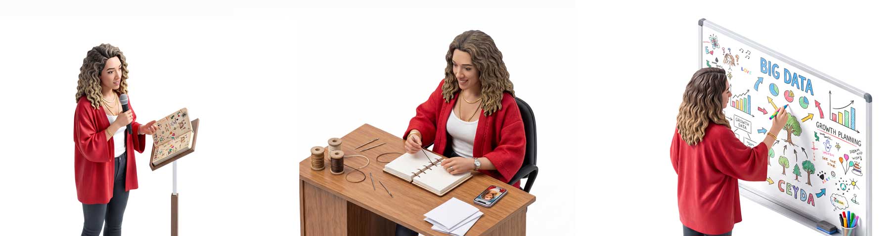 Sadece not almak için değil, toplantı öncesi hazırlanırken bile keyifli bir süreç deneyimlemek istiyor. Kendi kapağını tasarlayarak başlıyor: İlham verici çizimler, motivasyon notları ve kişisel temaları bir araya getirerek özgün bir tasarım oluşturuyor.